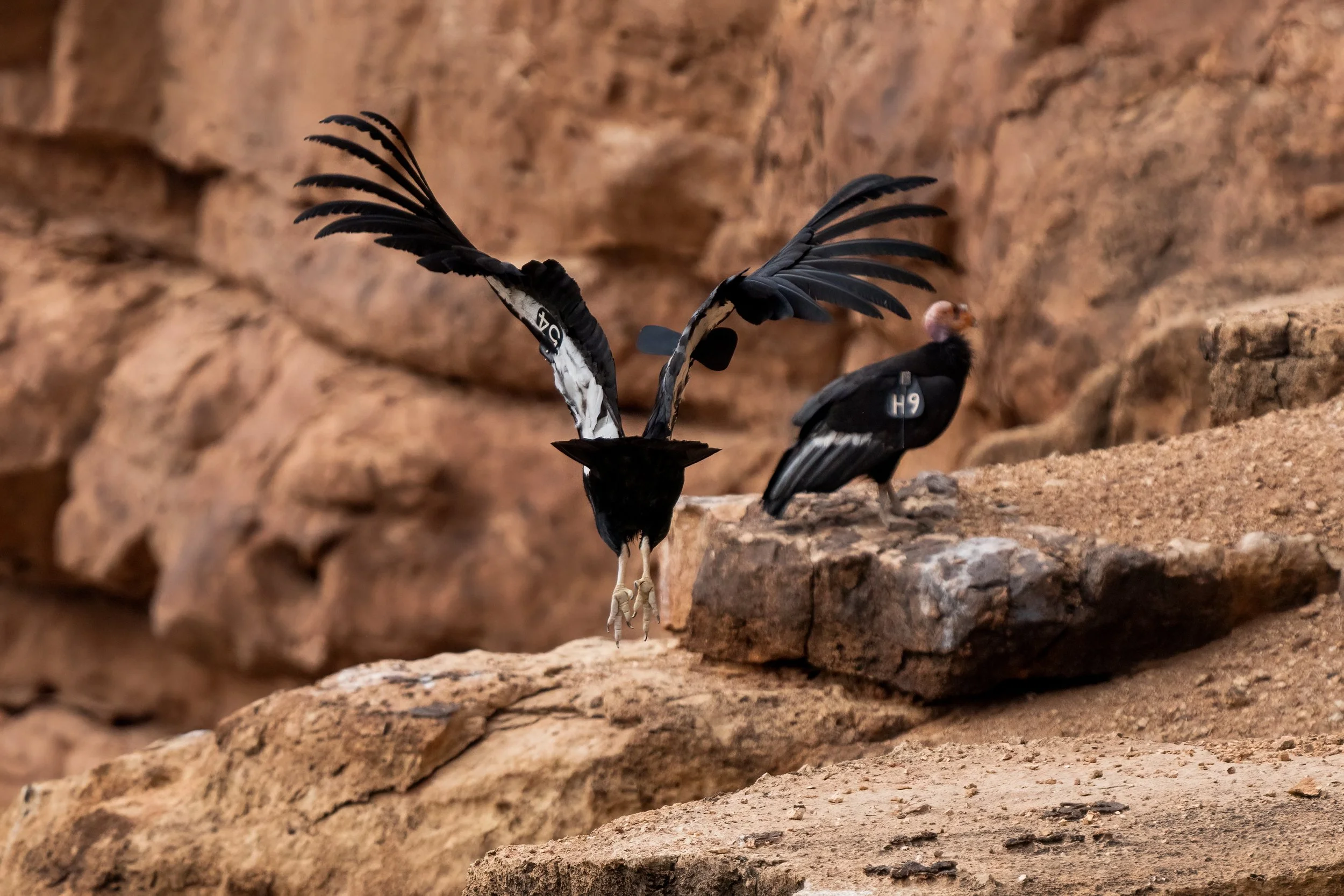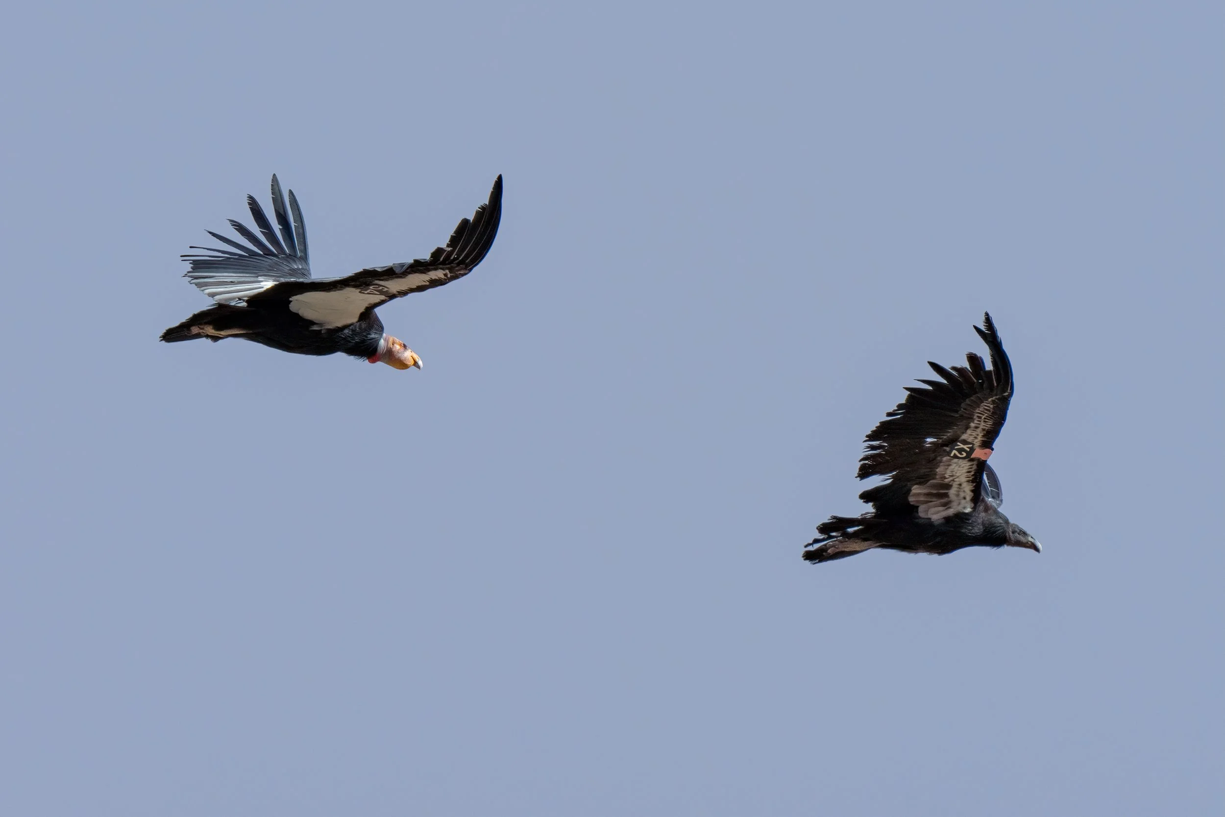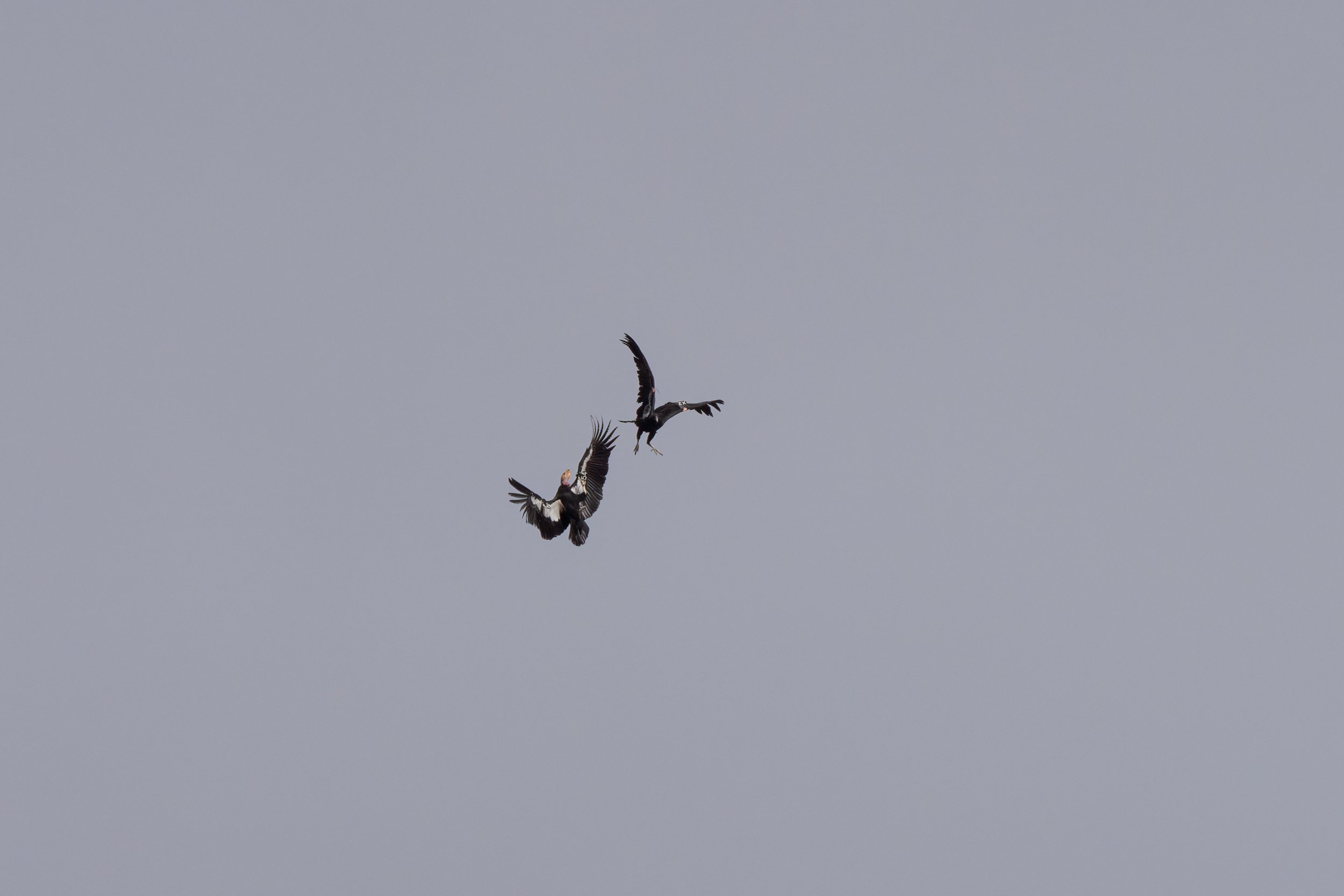 We were honored to see a complete family group on our visit. Condor 54, the male, is one of the more remarkable individual birds in the recovery program — nearly 18 years old at the time we saw him, a known breeder, and a bird with enough history behind him to represent the full arc of what the condor recovery effort has achieved since the species was brought back from the absolute edge. H9, the female, nearly 14 years old then, was sitting on a nearby cliff and seemed to be watching 54 soar through the skies. Then another bird, much darker in coloring, joined 54 in the sky! It was their fledgling X2! Seeing this family group was such an honor and was genuinely moving to watch. X2 and 54 seemed to be playing together in the sky, giving chase, then peaceful soaring on the thermals. It was such a memorable moment.