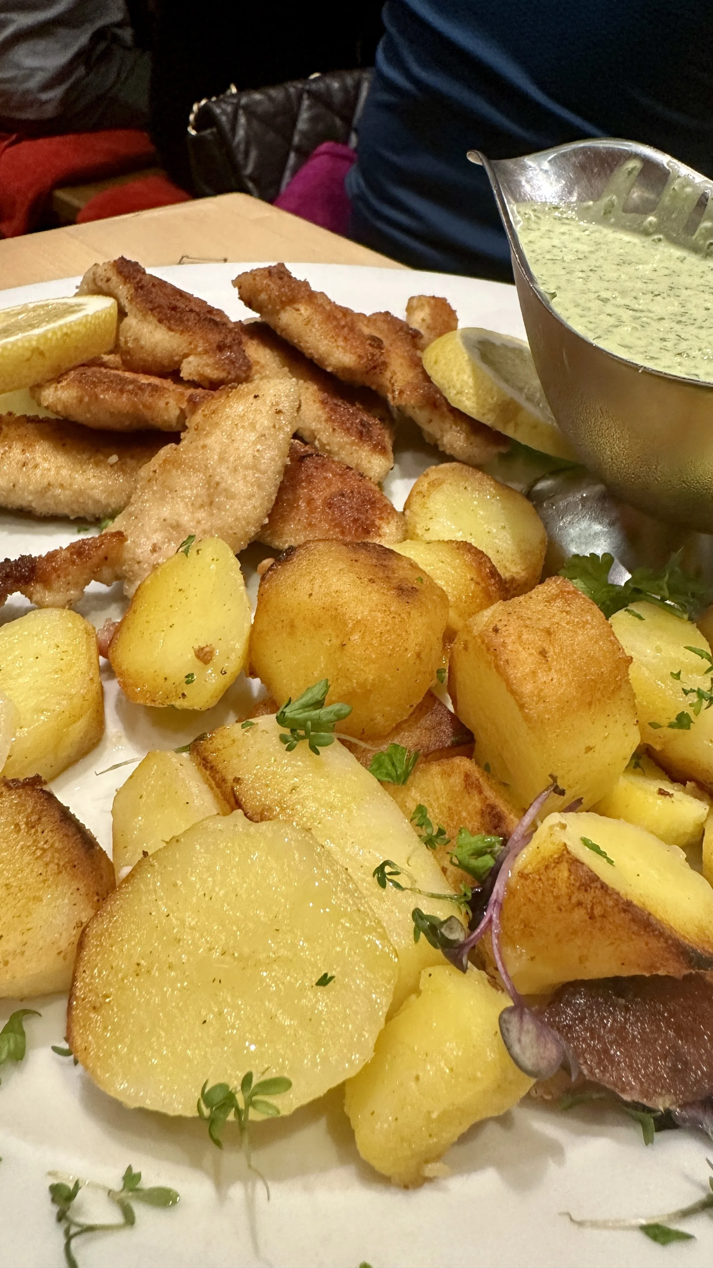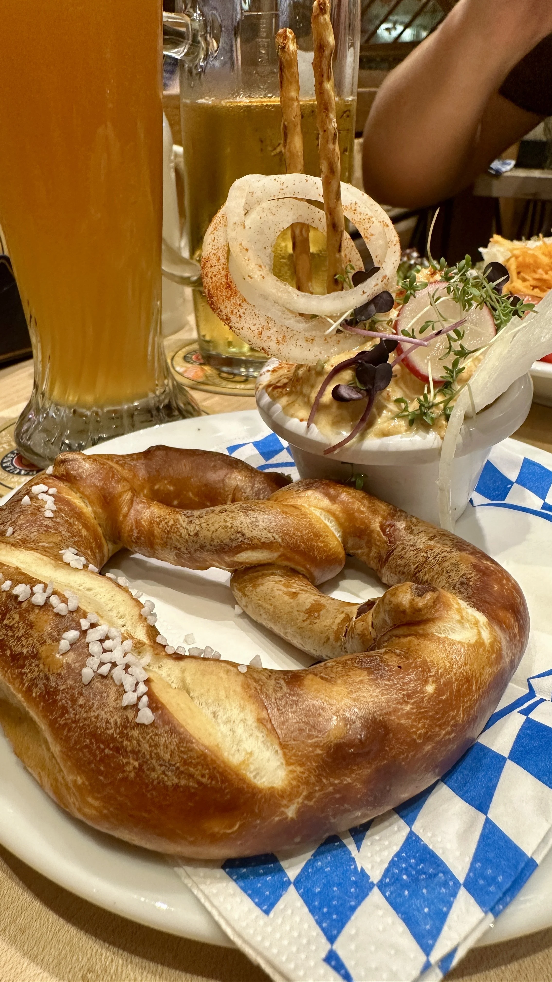 Back at the hotel, the Paulaner restaurant made a strong case for the Bavarian approach to dinner. The beer arrived in a proper half-litre glass, the pretzels were warm and chewy, and the schnitzel was thin, crisp, and served with a side of amazing potatoes. After a transatlantic flight and an afternoon walking the city, this was exactly the right meal.
