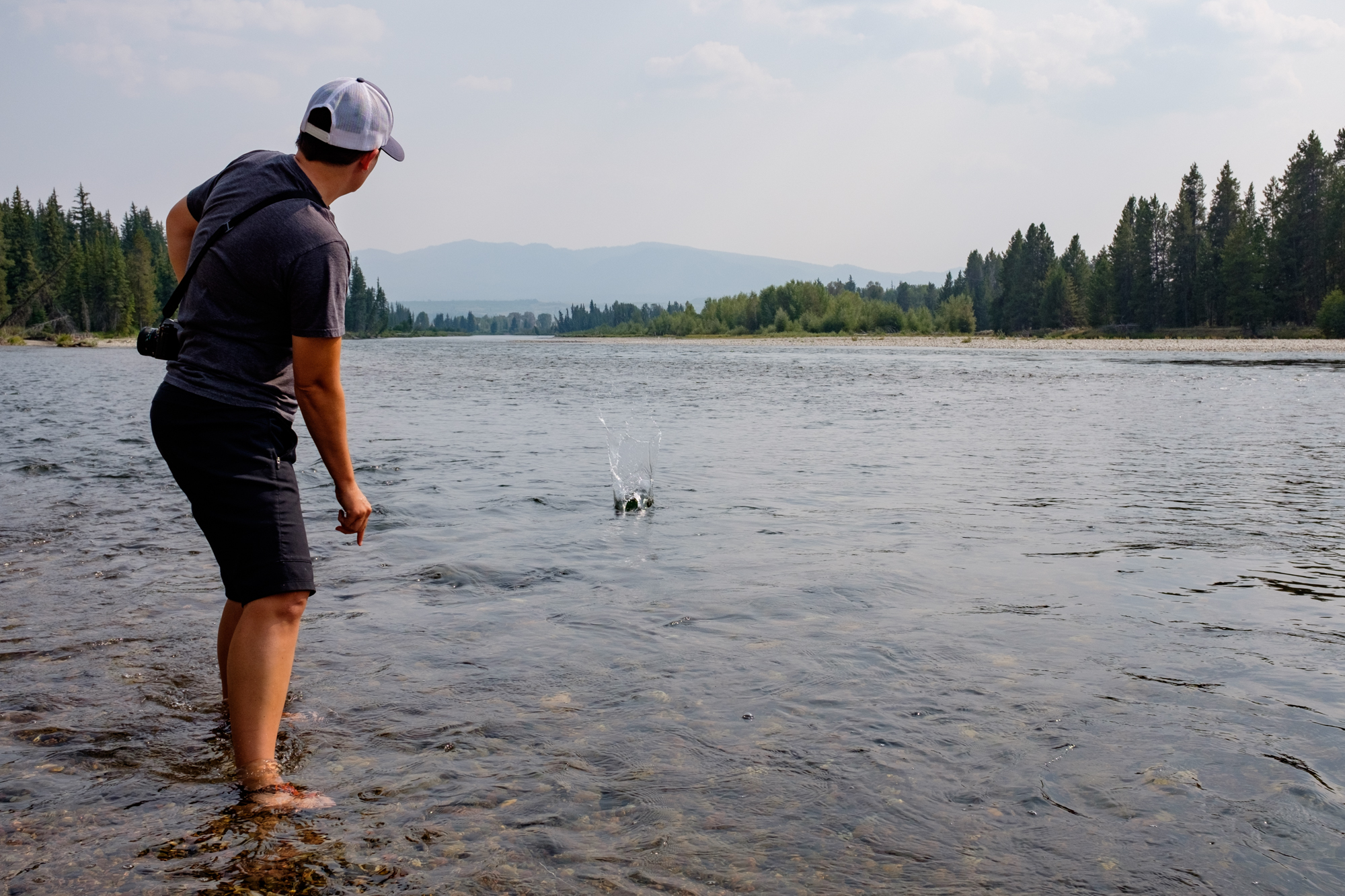 Our only hike in Grand Teton was around String Lake. We didn’t plan a lot of activity in Grand Teton, due to being there for only a short time, and planning to go chase rivers and waterfalls and mountain views. Th smoke didn’t cooperate, so we improvised as best we could, and opted to explore a bit of water from a trail. We parked at the String Lake Picnic parking area, and the parking lot led us very easily to a trail. We walked through the woods for about a mile or so, then the water just couldn’t be avoided. Kim jumped in, despite the water being about two feet deep and very cold. It was refreshing I’m sure, but I opted to stay in the water from the knees down, and enjoy the rain falling around me. The trail in this area follows the edge of the lake, and you are rarely far from the shore. We watched for bears and wildlife at every turn, but didn't run into any creatures!
