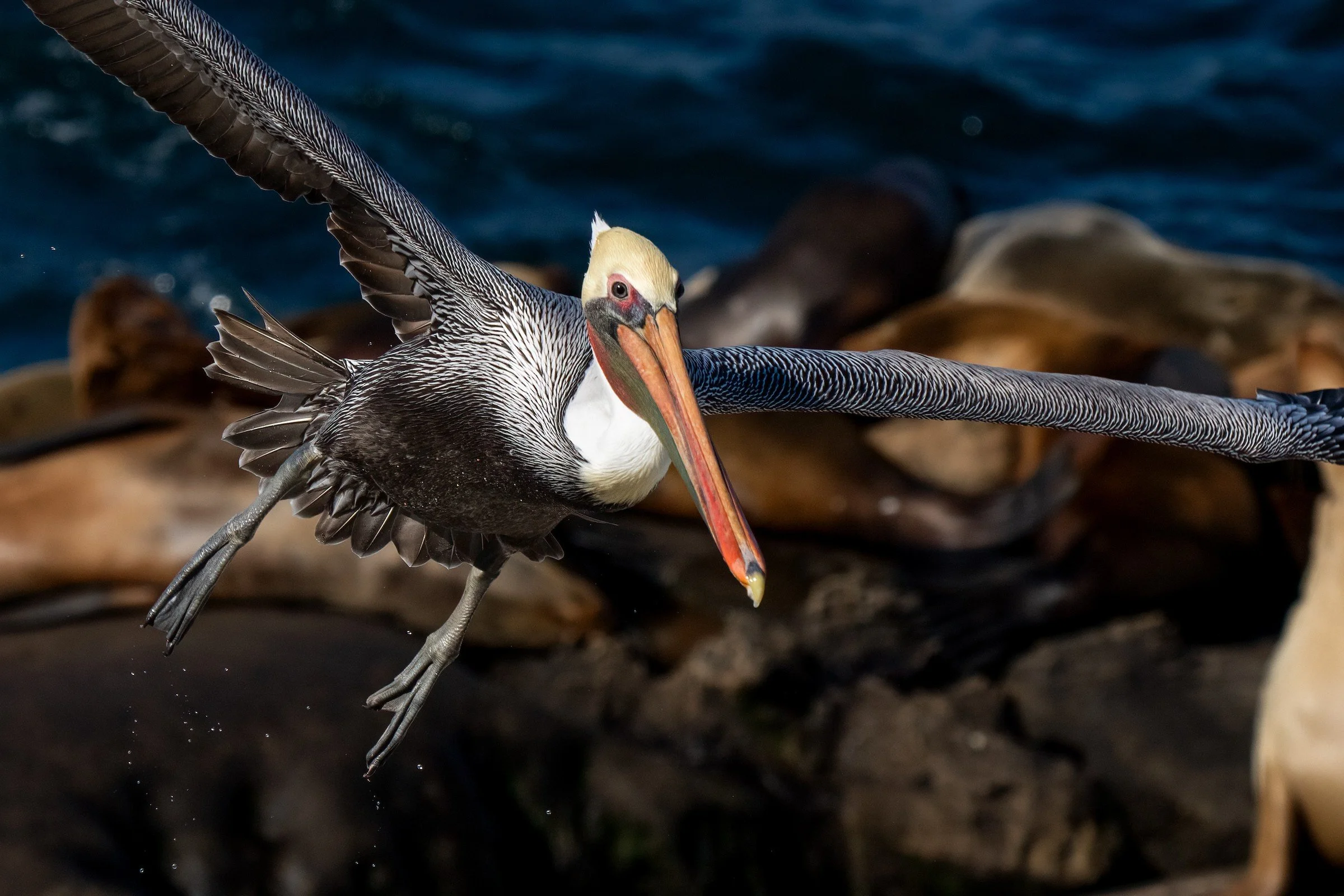 Few sights along the California coast are as immediately attention grabbing as a Brown Pelican dropping from the sky in a dive to get a fish snack. One moment it is a soaring silhouette, similar to a pterodactyl (I imagine) - the next, it is a precision-guided missile, folding its wings back, dropping its big feet and plunging headfirst into the Pacific with a confidence that makes you wonder how it all happens.