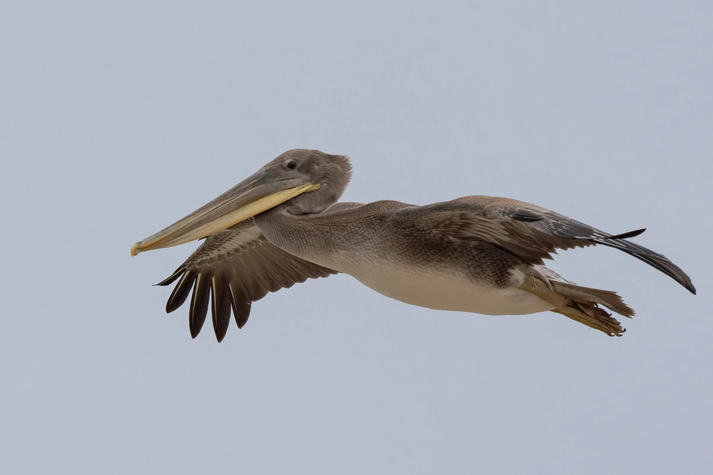 A juvenile Brown Pelican is a study in brown from head to tail, lacking the bold contrast of the adult, with a pale whitish belly and a dull, muted bill. They wear this understated plumage for a few years before the breeding colors of adulthood start coming in. They are my very favorite Brown Pelican to see, so soft looking and often silly!