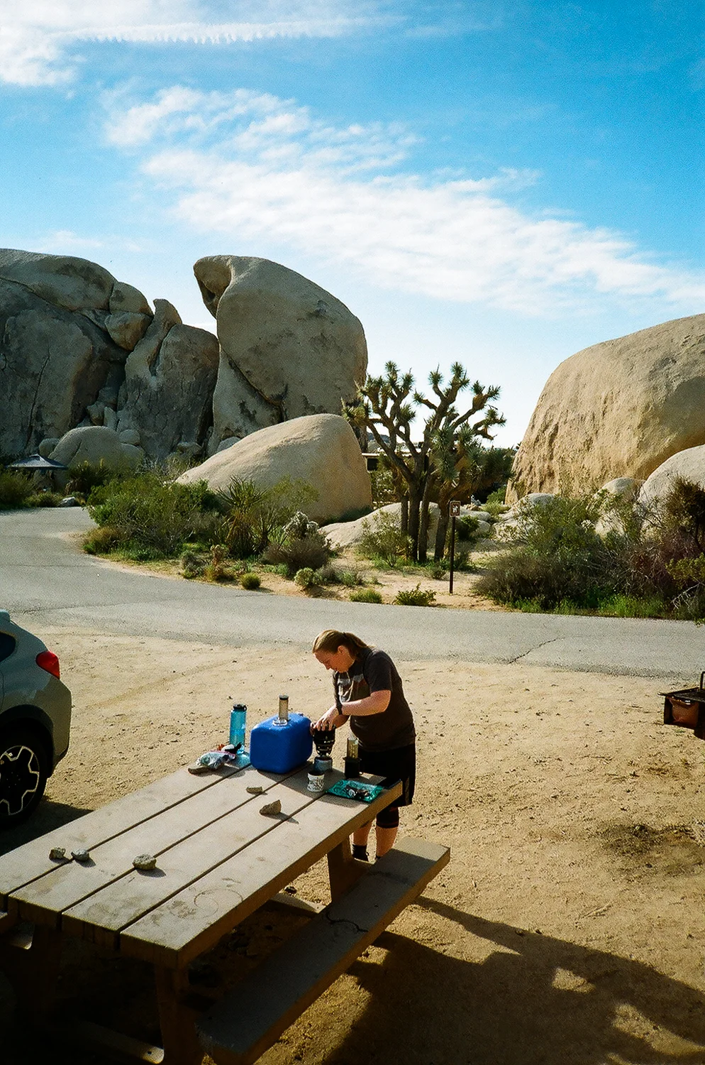 We got the best sleep of the night during the last hour or so that we were in the tent... the sun had just started to light up the sky, but wasn't all the way up, and things quieted down enough to be restful. When the sun decided to pop up over our boulder yard, things warmed up rapidly. It was a relief to feel that warm sunshine on our bodies for the first few minutes. Then we started packing things up to avoid getting too warm, and headed back down the trail. We drove a short distance to one of the campgrounds and found a few empty sites, so we snagged one and borrowed the table to make coffee and breakfast. We climbed up on a nearby boulder and enjoyed a quiet morning with our coffee... this moment is when we remember why we do this.