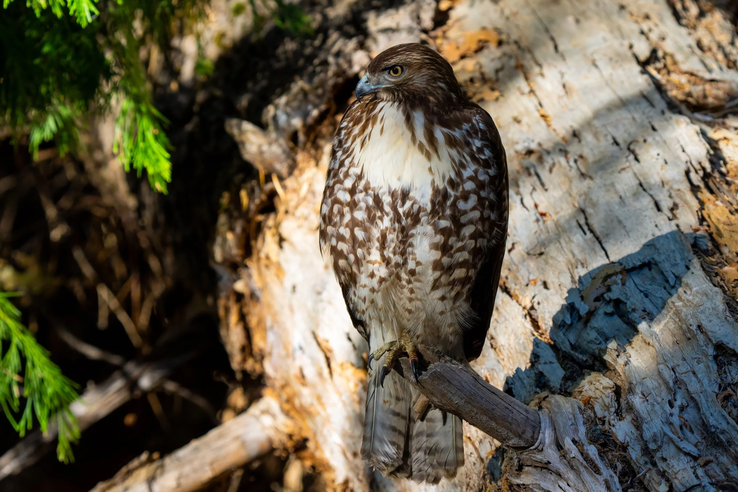 Red-tailed Hawk Red-tailed Hawks are visible from the open meadow sections, often hanging on a thermal above the ridgeline. But sometimes you get lucky, and one is sitting low, just off the trail, enjoying a rest in the shade!