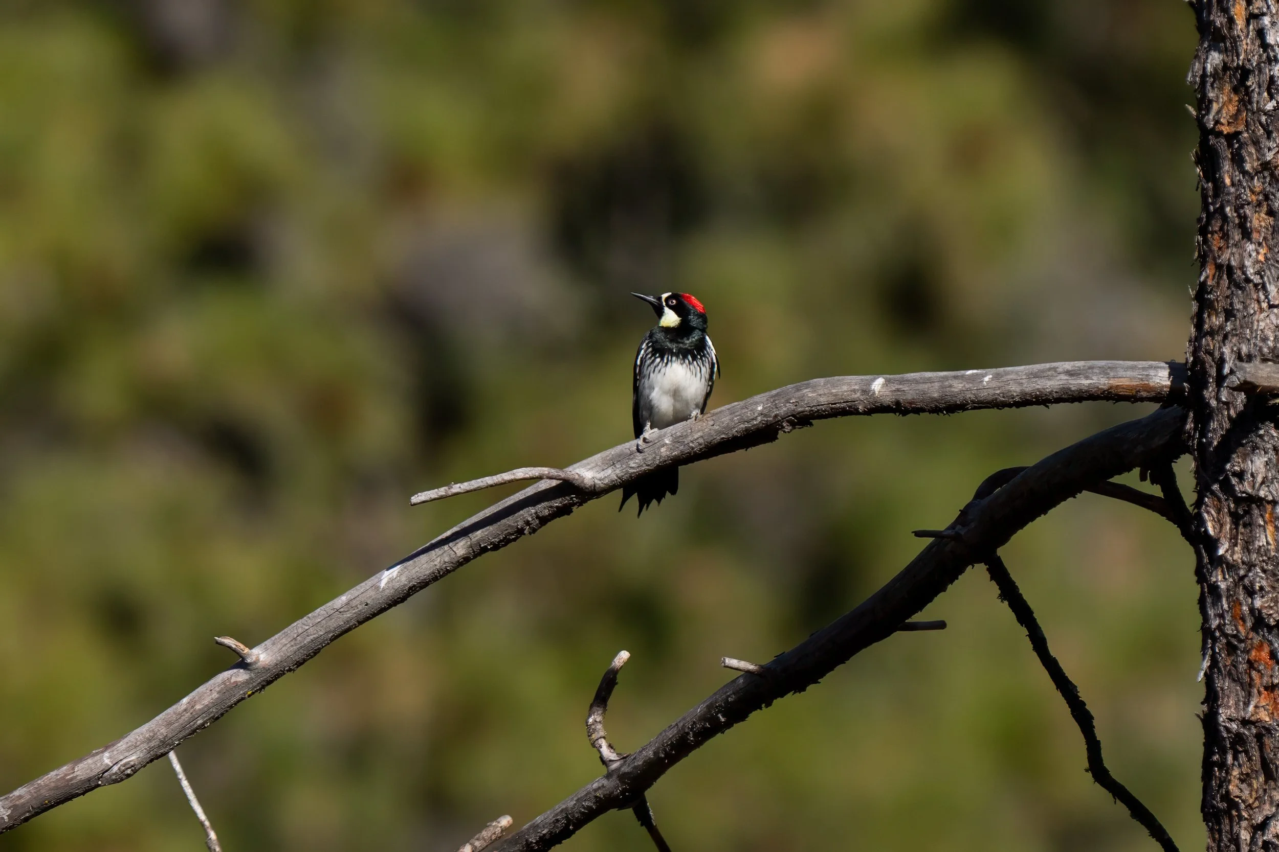 Acorn Woodpecker Acorn Woodpeckers are hard to miss once you know what to listen for, a rolling, laughing call that carries through the oak woodland before the bird itself comes into view. They are communal and industrious, working in family groups to drill and maintain the granary trees where they store thousands of acorns, one per hole, against the winter.