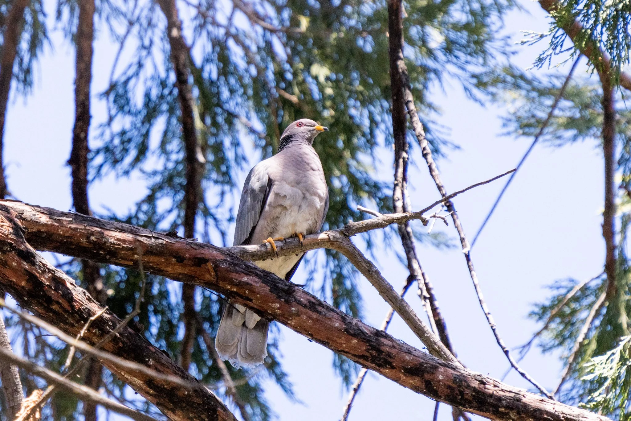 Band-tailed Pigeon Band-tailed Pigeons pass through in small groups, usually heard as a rush of wingbeats before they come into view. They're the wild relative of the familiar city pigeon, but similarly as goofy.