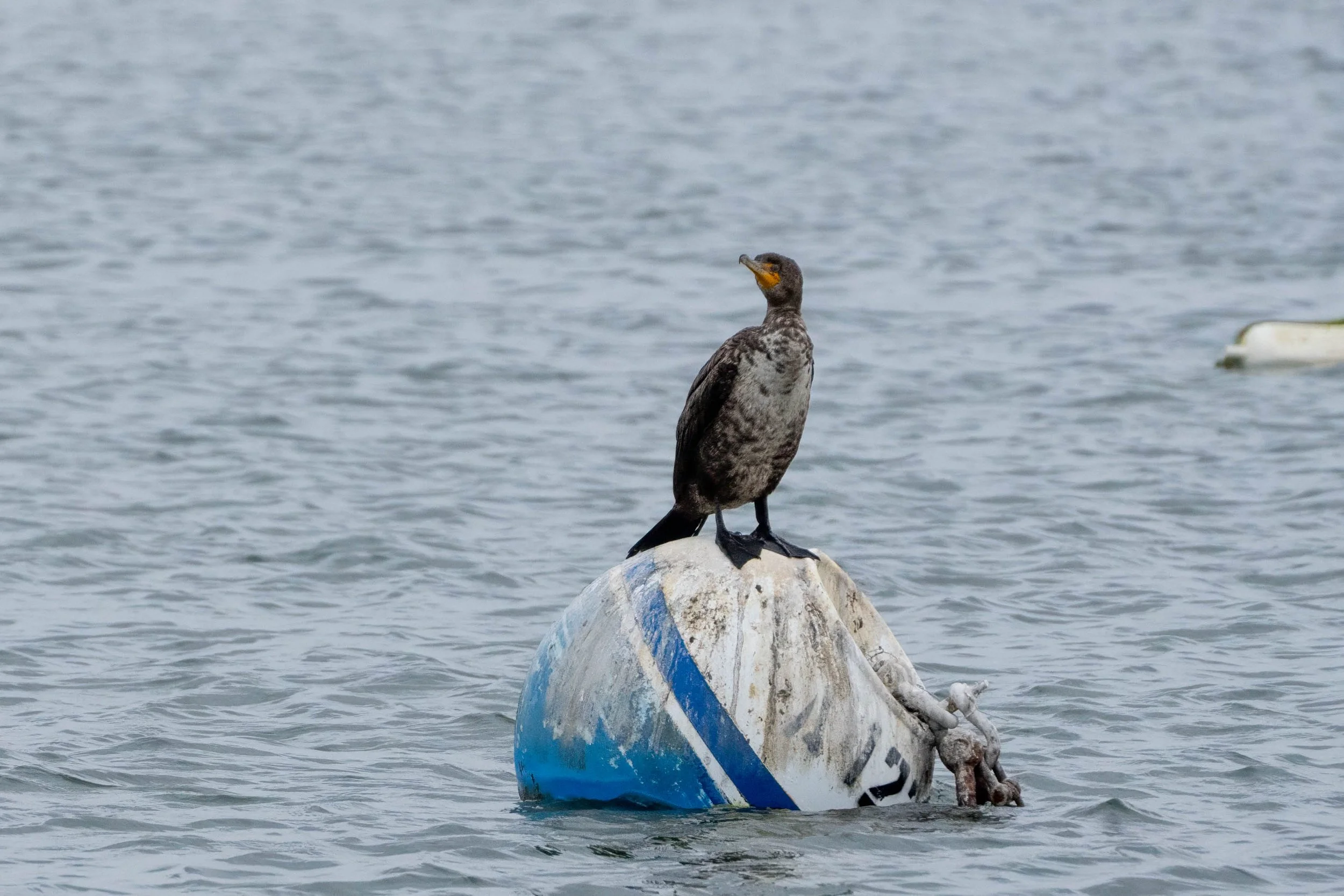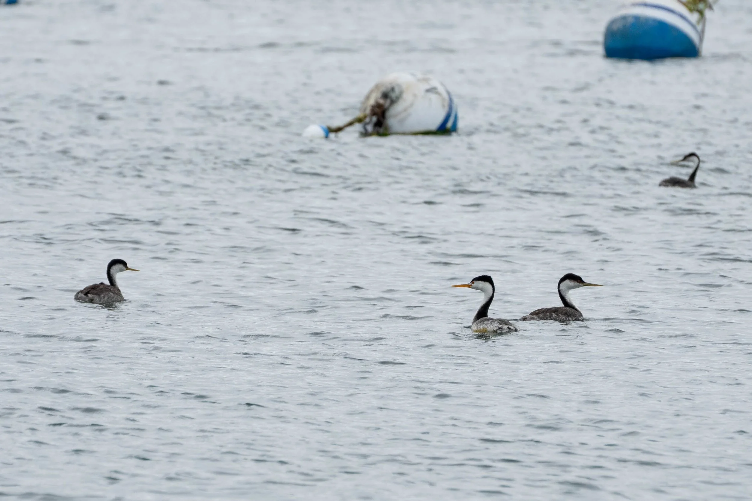 Clark's Grebes and Western Grebes were floating around in the harbor before departure.. A Double-crested Cormorant was posted on a buoy.