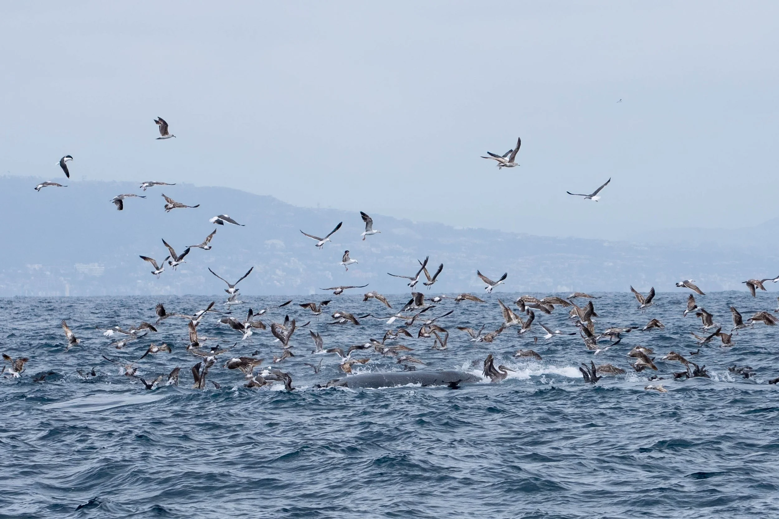 The Western Gulls working the surface during the lunges added a chaotic edge to the whole scene. They were diving in to grab anchovies at the exact moment the whales were coming up, which is a great strategy… until it isn't. One gull got caught in the mouth of a whale mid-lunge! Thankfully the whale noticed and spit the bird out! The gull appeared fine, for what it's worth, and seemed no less interested in anchovies afterward. But the whole boat was thoroughly entertained by its misfortune in that moment.