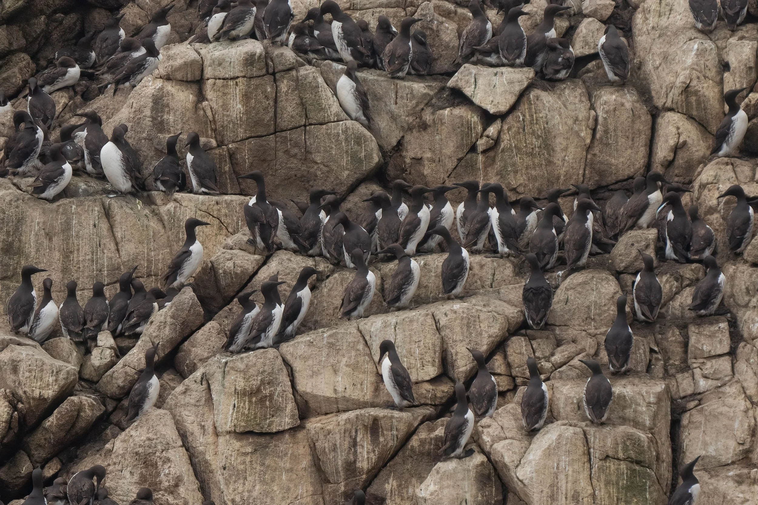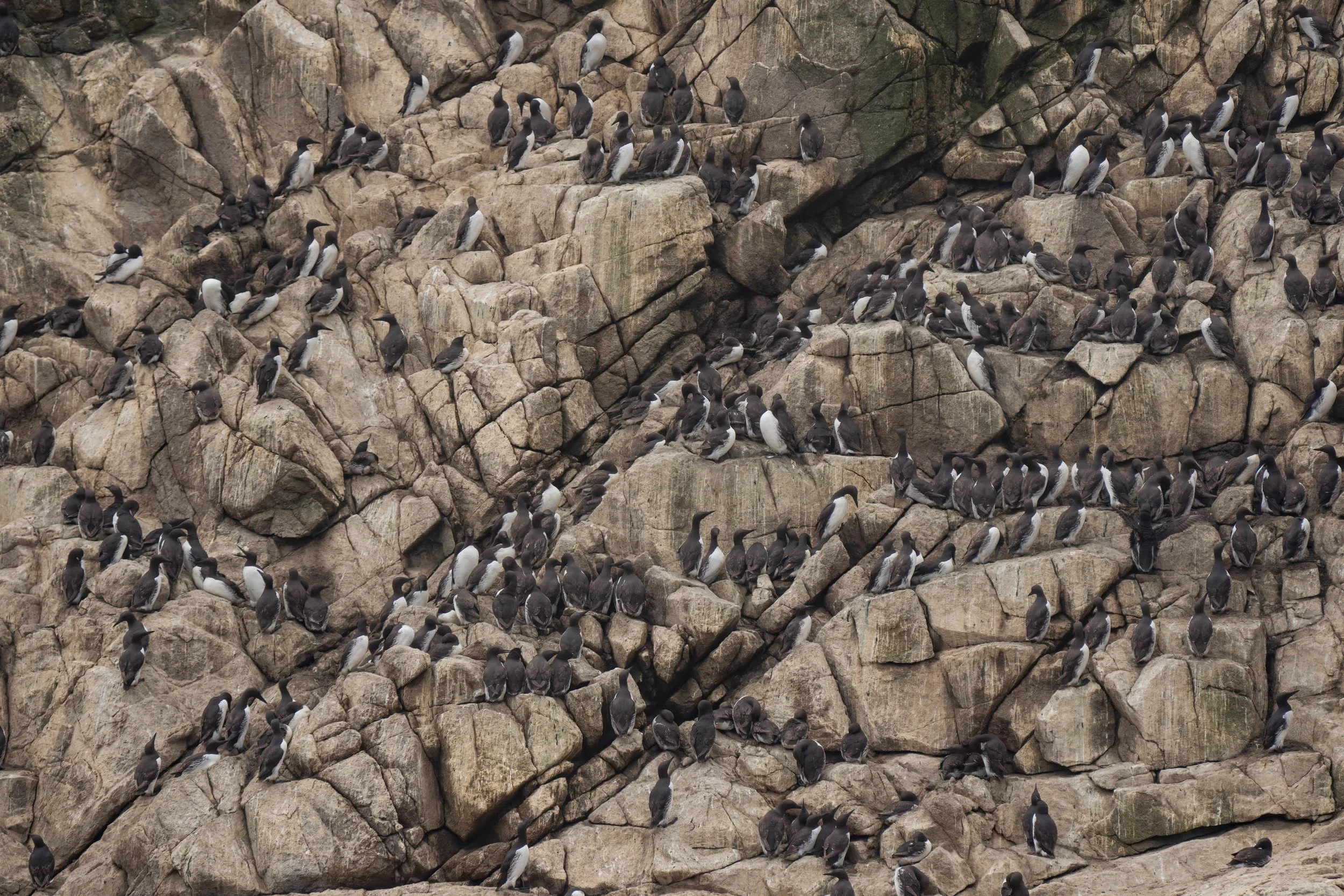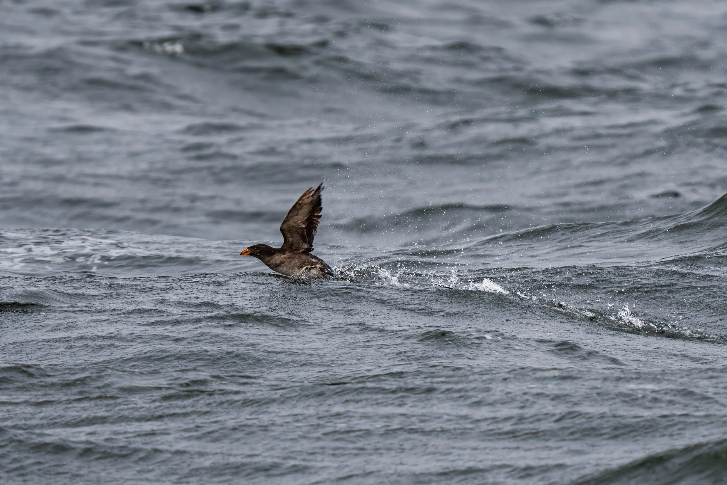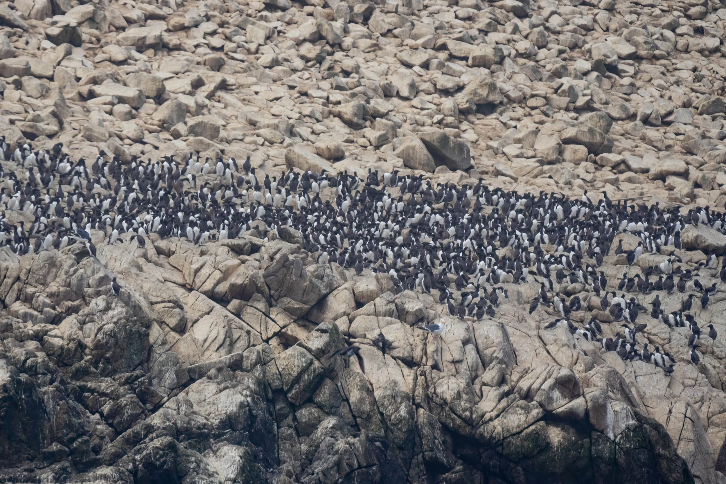 Common Murres dominated the scene, nesting in dense colonies packed shoulder to shoulder on every available rock ledge in the way that murre colonies always are - thousands of birds in a space that seems impossibly crowded and yet functions with efficient chaos. Pigeon Guillemots flew back and forth between the water and the island in small groups, the bold white wing patches and bright red feet distinctive in flight. Tufted Puffins on the upper slopes were among the most striking birds at the islands, their large orange bills and white facial plumes visible even at boat distance. Rhinoceros Auklets moved through the water around the island, and a few Cassin's Auklets added to an already strong alcid showing.