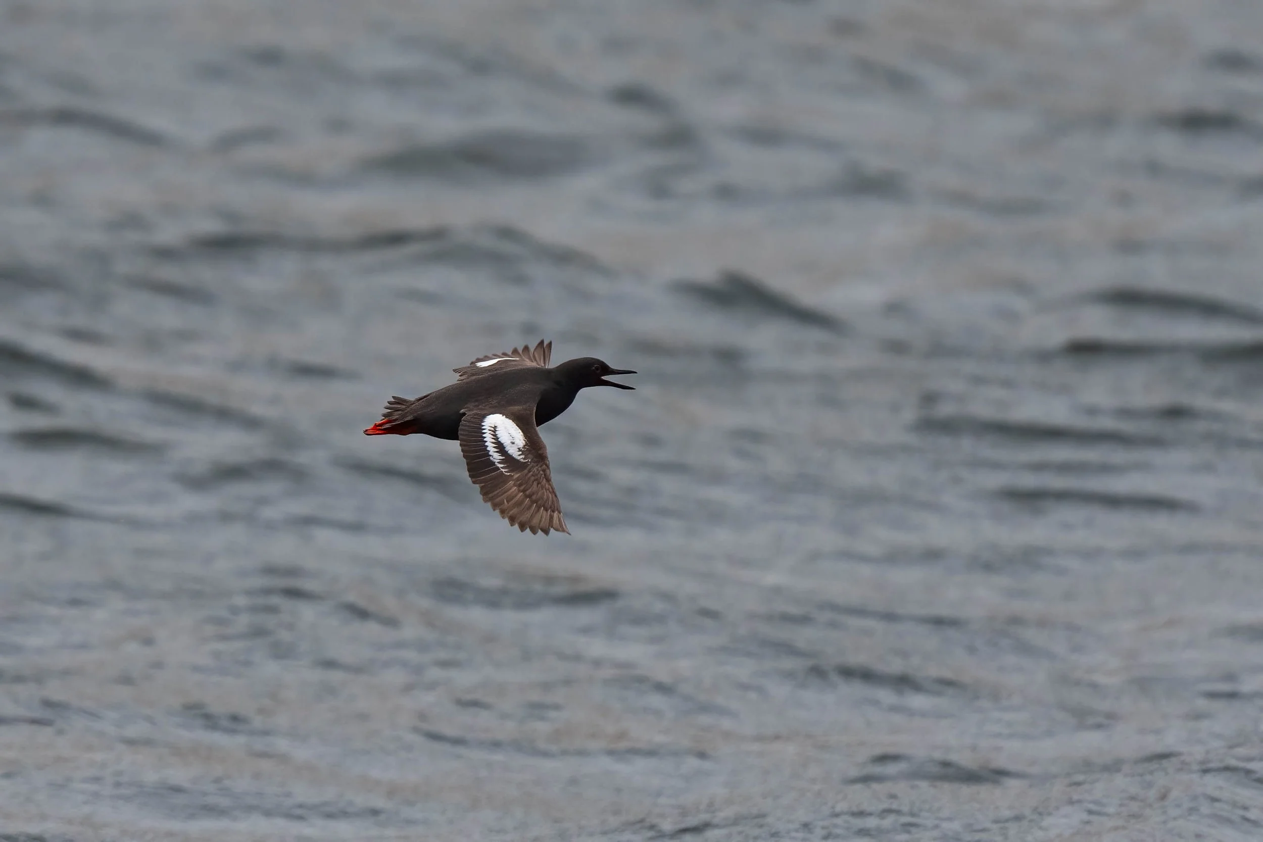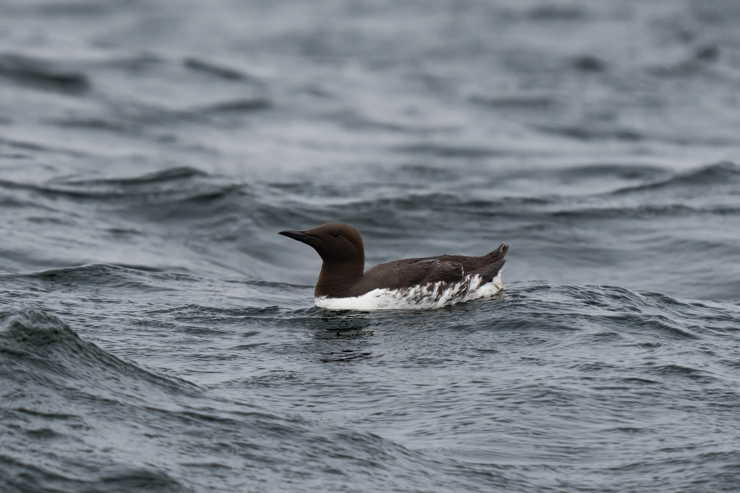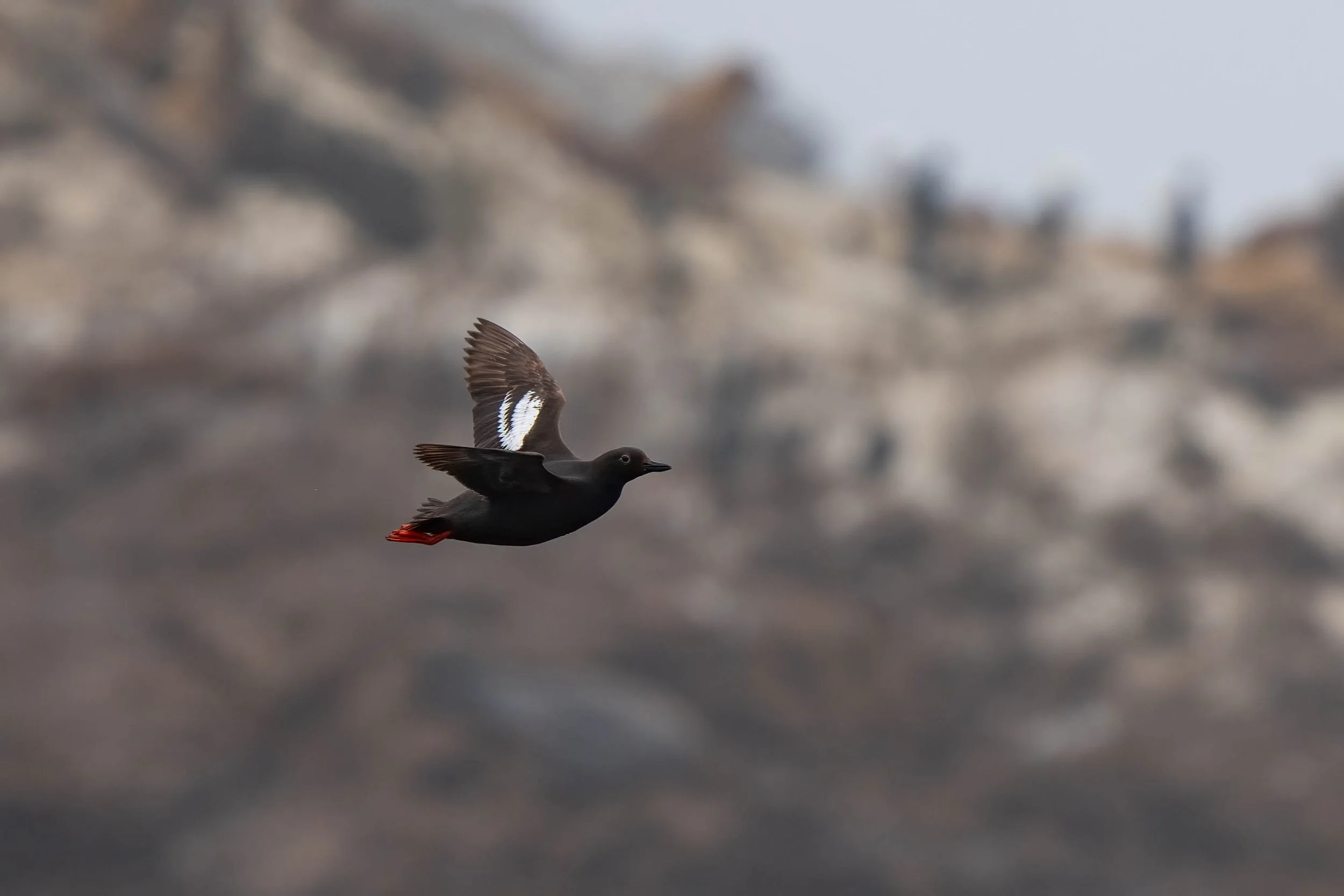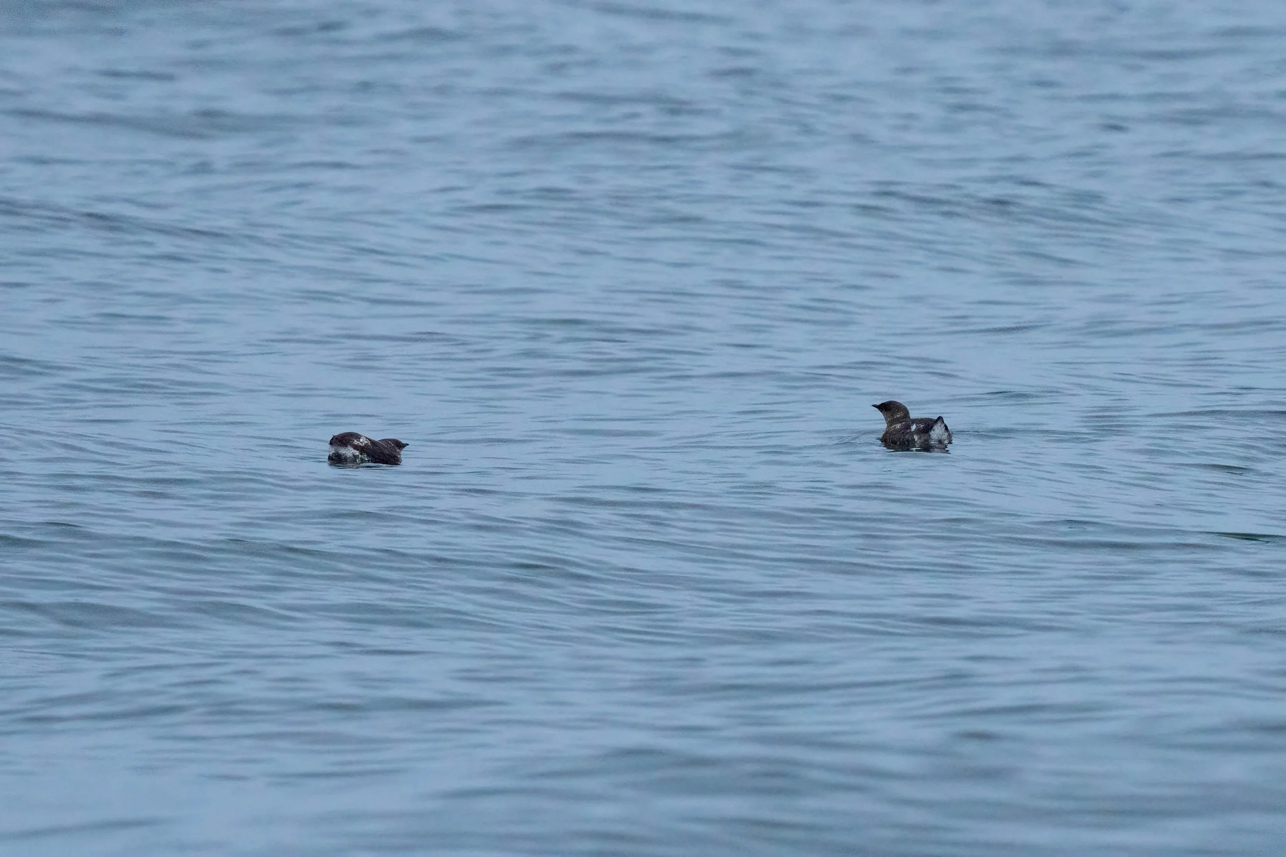 Common Murres dominated the scene, nesting in dense colonies packed shoulder to shoulder on every available rock ledge in the way that murre colonies always are - thousands of birds in a space that seems impossibly crowded and yet functions with efficient chaos. Pigeon Guillemots flew back and forth between the water and the island in small groups, the bold white wing patches and bright red feet distinctive in flight. Tufted Puffins on the upper slopes were among the most striking birds at the islands, their large orange bills and white facial plumes visible even at boat distance. Rhinoceros Auklets moved through the water around the island, and a few Cassin's Auklets added to an already strong alcid showing.