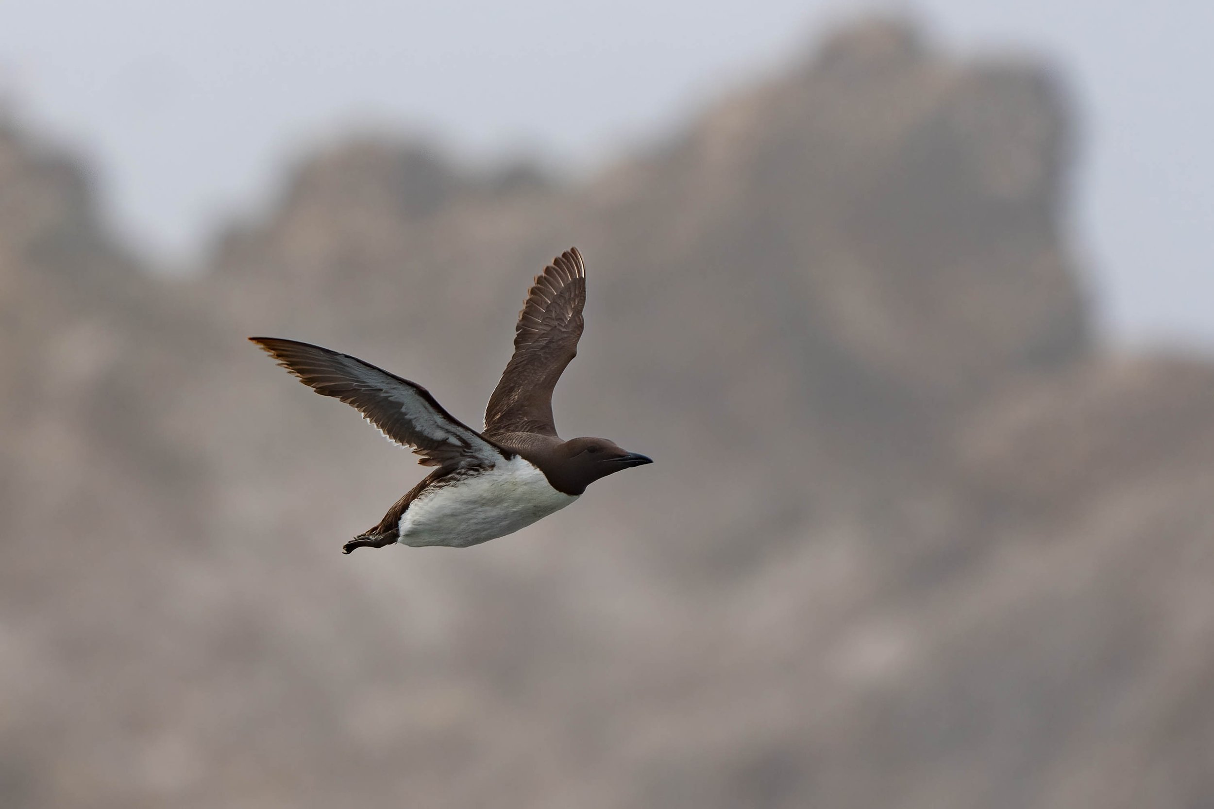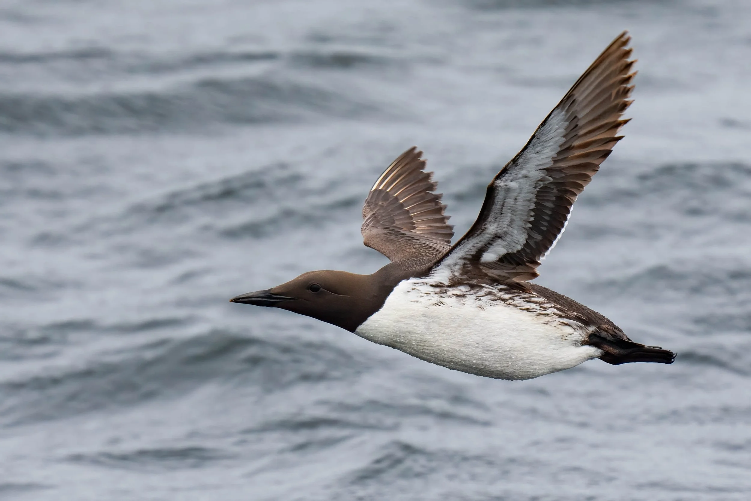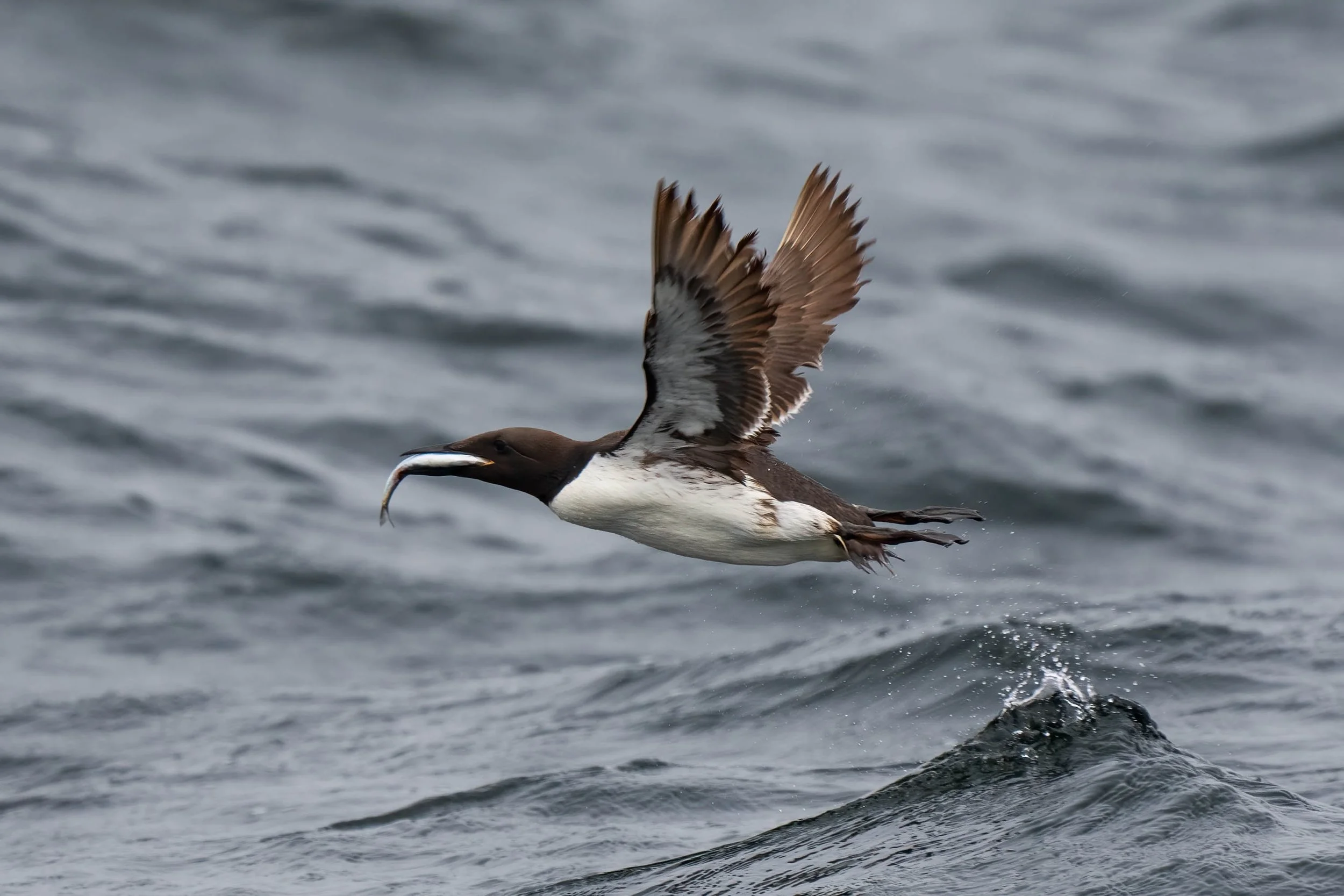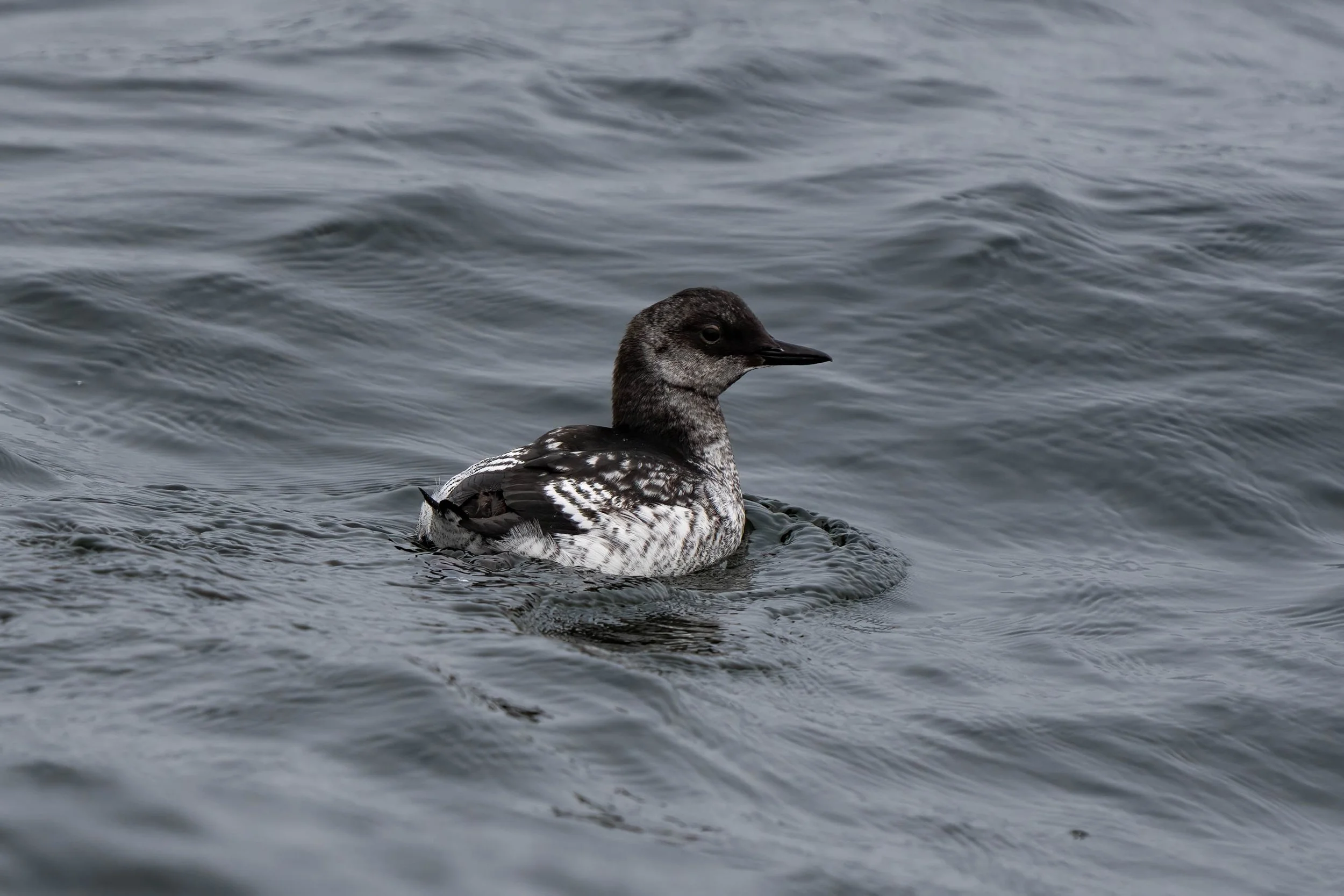 Common Murres dominated the scene, nesting in dense colonies packed shoulder to shoulder on every available rock ledge in the way that murre colonies always are - thousands of birds in a space that seems impossibly crowded and yet functions with efficient chaos. Pigeon Guillemots flew back and forth between the water and the island in small groups, the bold white wing patches and bright red feet distinctive in flight. Tufted Puffins on the upper slopes were among the most striking birds at the islands, their large orange bills and white facial plumes visible even at boat distance. Rhinoceros Auklets moved through the water around the island, and a few Cassin's Auklets added to an already strong alcid showing.